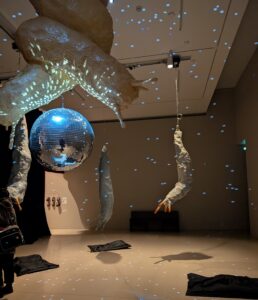 Two entwined leopard slugs above a glittering disco ball represent the frankly bonkers way leopard slugs reproduce, and the spinning lights made the room unsettling and disorienting.