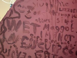 A large display in the centre of the room was, for me, surprisingly emotionally confronting. Above boards where visitors could add their own clay marks were the words “Have no shame for the marks of your wetness”.