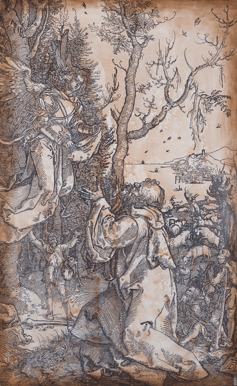 “Java of Dürer” began when I tried to research the development of art in the Renaissance period, especially engravings. I was at that time curious about Gutenberg, who certainly bore a strong connection with text and prints. Then I found Albrecht Dürer. From there, I tried to draw a correlation between printing and fine art. However, what good would it do if I became awed by other countries’ masterpieces at the expense of my own nation’s? Then I tried to correlate both worlds, in terms of period, predisposition, and character. Subsequently, I began to conceptualize the technical aspects of the piece, by correlating Dürer with Babad Tanah Jawi in its original hanacaraka. I wrote the alphabets with drawing pens upon canvas with a background painted in acrylic, molding it in such a way as to recreate Albrecht Dürer’s graphic art work “The Men’s Bath”.